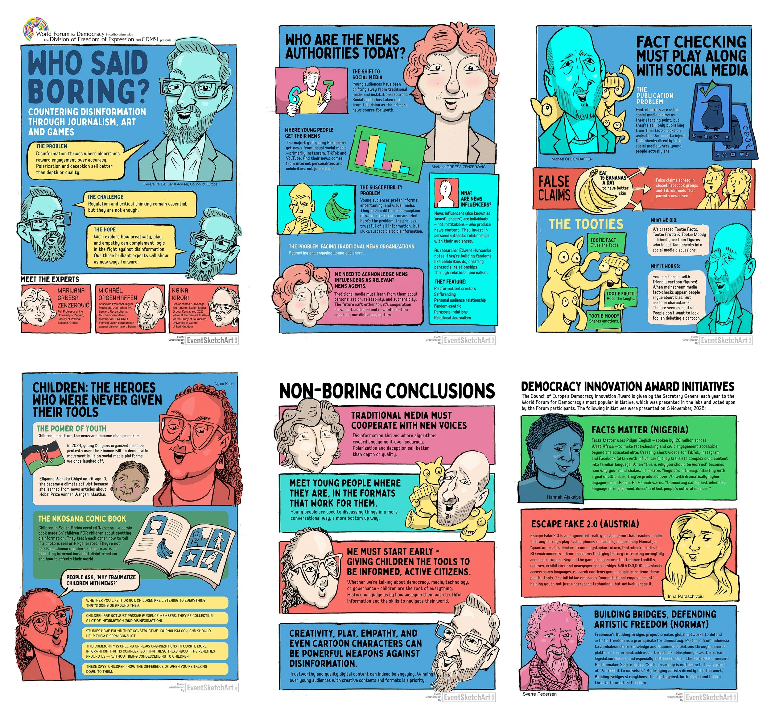 Event sketch from the Forum for World Democracy (2025) in Strasbourg, France. This sketch was from the presentation “Who Said Boring? Countering Disinformation Through Journalism, Art and Games”.